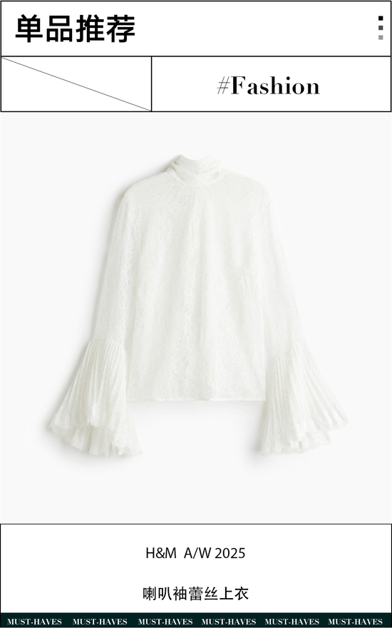 H&M 2025秋冬系列这款喇叭袖蕾丝上衣在设计上采用垂褶立领,长系带搭配背面水滴形开口增添灵动感,喇叭袖口的褶裥和薄纱在穿搭上更便于搭配出层次。