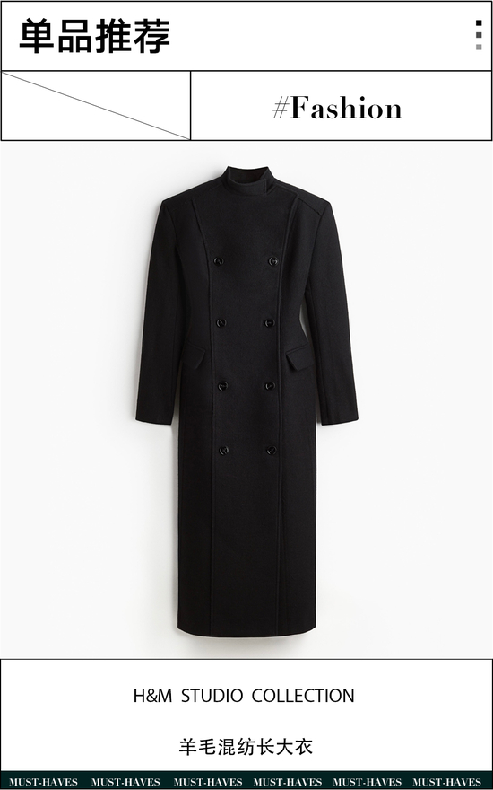 H&M STUDIO COLLECTION这款羊毛混纺长大衣在设计上选用双排扣,立领及垫肩设计打造利落廓形,同时在面料上兼具松垮感,直筒下摆与加长开衩的后摆为整体造型增添气质。