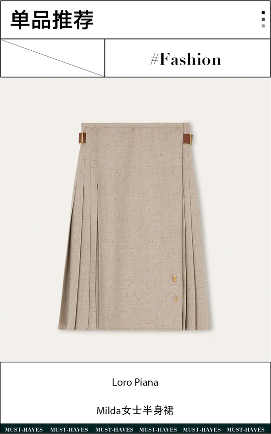 Loro Piana这款Milda半身裙散发浓郁的苏格兰风情。采用轻盈的羊绒混纺法兰绒面料制成,巧妙融合羊毛与棉,呈现出丰富褶皱纹理与柔和挺阔的垂坠感。