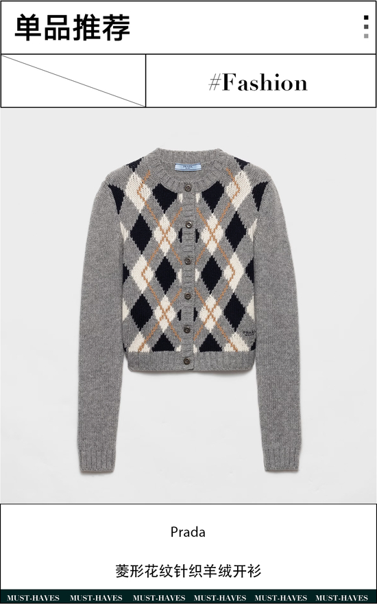 Prada这款菱形花纹图案修身开衫配以几何形状,柔软触感便于应对秋天多变的气温,呈现独特而高雅的轮廓。