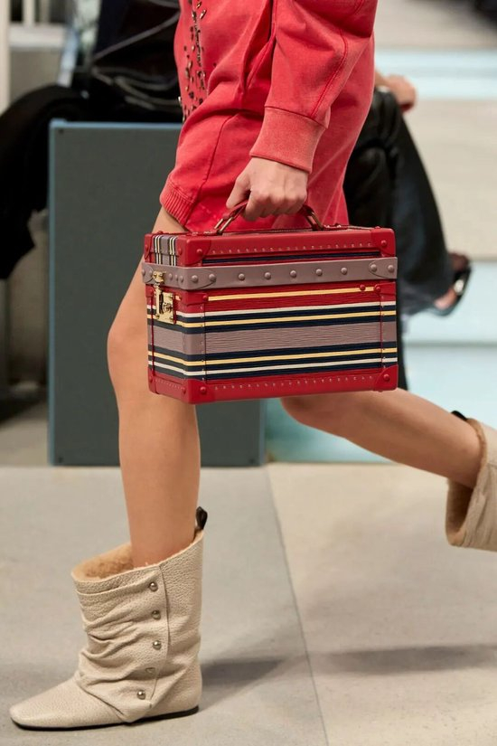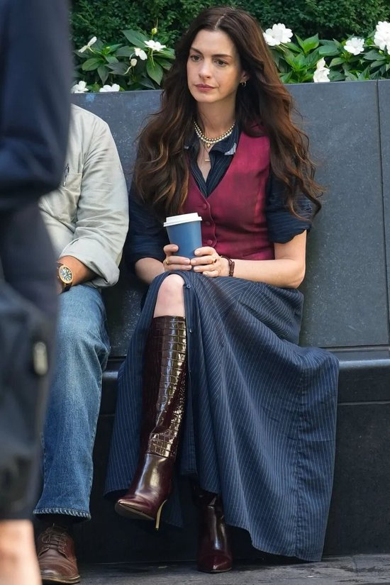 安妮海瑟薇最近拍《穿Prada的女魔头2》,上脚的一双红棕色鳄鱼压纹长靴,也来自它们品牌。