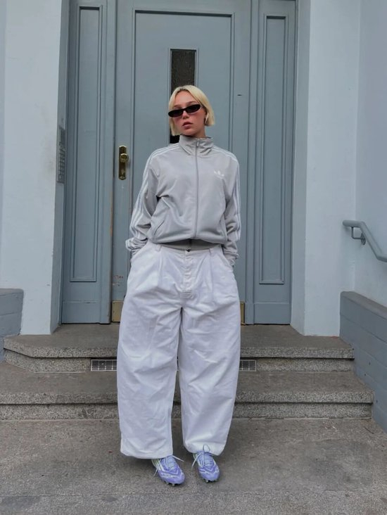 薄底德训鞋搭配廓形套装,内搭可选择紧身或crop top露出腰线,打破套装的沉闷感,营造干练又时髦的职场形象。