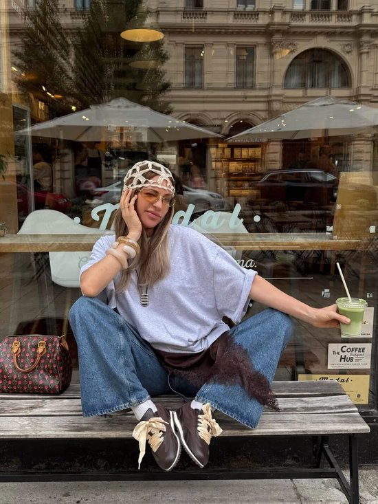 而在另一套造型中,她选择Dries Van Noten咖色薄底德训鞋为核心,搭配条纹Polo衫与牛仔阔腿中裤,复古松弛又显利落,日常好借鉴。