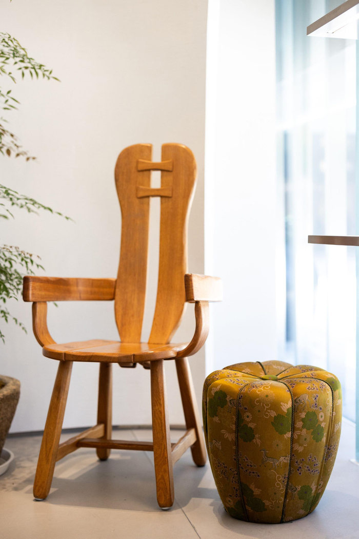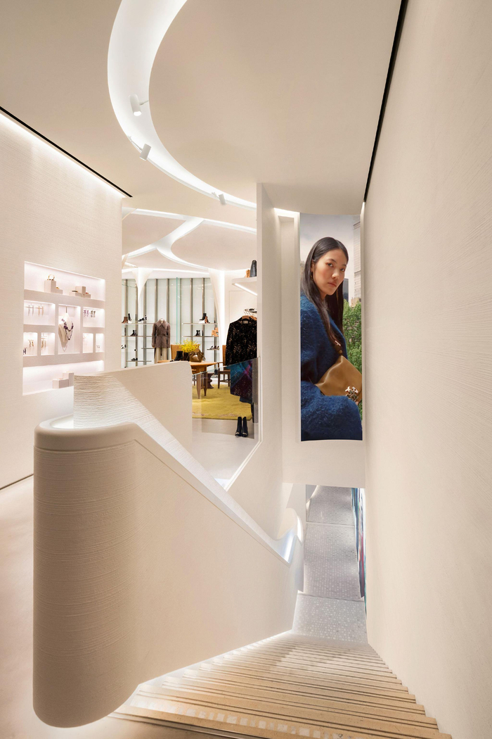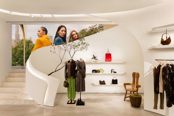 室内采用弧形石膏墙面构筑简约背景,与Tory女士亲自甄选的别致陈设与装饰相得益彰。跨越数十载的古董作品融合多元风格,展现法国装饰艺术、美国世纪中期现代主义、粗犷主义及苏格兰手工匠艺的交织碰撞。定制地毯选用烟草褐、铁锈红及青苔绿等浓郁色调,致敬TORY BURCH 2004年在纽约开设的首家精品店。