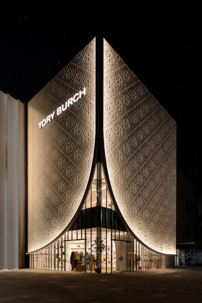 全新旗舰店落址于上海南京西路这一全球瞩目的繁华地标。此处对品牌而言意义非凡——2014年,TORY BURCH的中国首家旗舰店便于此启幕。全新旗舰店外墙以纯白色调焕新登场,其设计仿若徐徐拉开的帷幕,表面更蚀刻有品牌标志性的T Monogram图案。日间,阳光可穿透幕墙,洒进室内;而至夜幕时分,外墙则泛起柔和的金色光晕,静谧而璀璨。