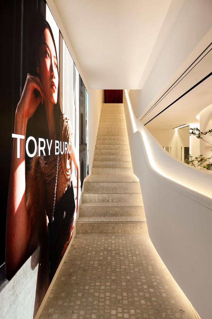 Tory女士与多位艺术家及手工匠人为全新旗舰店携手合作打造定制作品,其中包括中国艺术家胡欣怡(Xinyi Fox Hu)。她以创作自然与神话题材陶瓷雕塑作品闻名,为新店打造了超现实镜面装置,贯穿店里的空间。手袋与鞋履专区的釉面瓷展架由巴塞罗那的Xavier Mañosa艺术工作室制作,马海毛软榻与高背椅的明艳提花织品则出自TORY BURCH的成衣面料团队。全新旗舰店由Tory女士与 Curiosity建筑和室內设计工作室的 Gwenaël Nicolas 再度携手合作打造。品牌位于纽约与洛杉矶的旗舰店建筑,亦是由二人倾力打造。