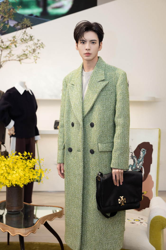 歌手及演员毕雯珺身着TORY BURCH 2025秋冬系列绿色不规则斜纹大衣、棉质工装裤、CHARLIE全新包袋亮相活动现场;