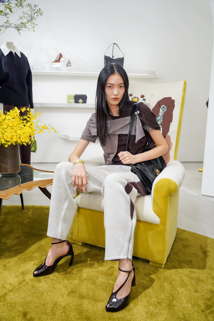 超模李禾佳身着TORY BURCH 2025秋冬系列羊毛开衫、羊毛亨利衫、运动长裤、T型带鱼嘴高跟鞋、CHARLIE全新包袋、波浪形耳环亮相活动现场。