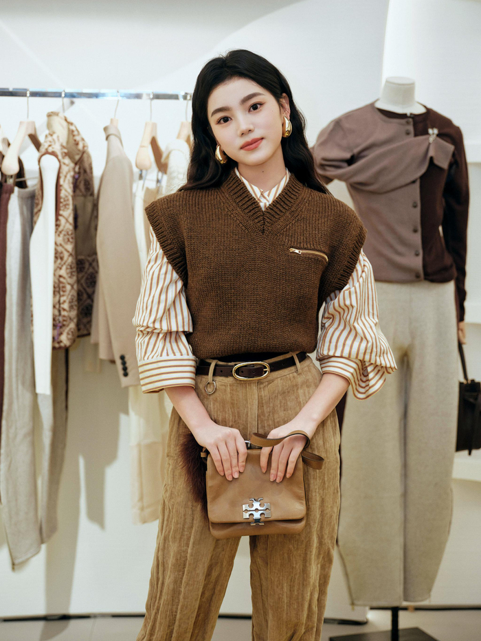 演员吴浔知夏身着TORY BURCH 2025秋冬系列羊毛马甲、棉质喇叭袖衬衫、棉质天鹅绒裤、穿孔皮带、T型带鱼嘴高跟鞋、CHARLIE全新包袋、波浪形耳环、羽毛吊饰亮相活动现场;