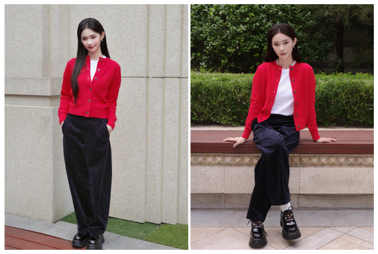 林允这身造型则很适合日常穿着,灯芯绒弯刀长裤的褶皱和表面的肌理充满暗影的光泽,上身搭配珊瑚红色开衫,形成强烈色彩对比,醒目却不突兀。一丝不苟的黑长直发与适度浓重的眼妆,更是让整体造型简明干净,极具个性。