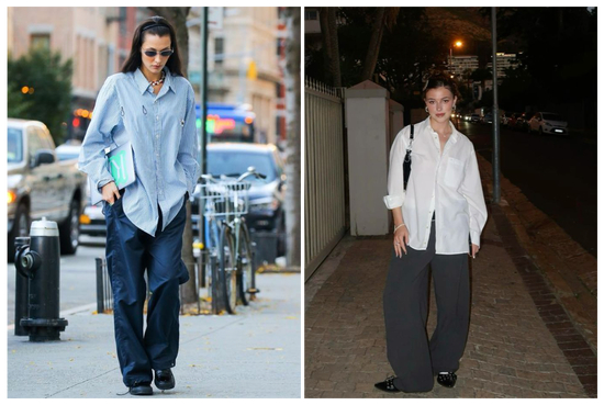 宽松衬衫与阔腿长裤的组合,堪称舒适穿搭的典范。整体造型松弛有度,尤其是自然垂坠的衣摆,低调内敛中透出些许清冷气质,既不拖沓也不刻意。