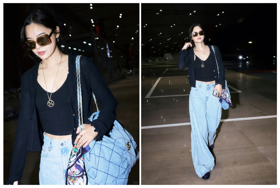 辛芷蕾这身造型远看只是开衫搭配牛仔裤的基础款穿搭,但当镜头放大,开衫与内搭皆采用暗纹面料,袖口缀以微张花边,宽松浅色牛仔裤裤边两侧两条裤线让厚重的牛仔裤也能穿出飘逸的感觉,而裤脚上方更是有小配饰作为收紧裤型的作用,很有静酷的格调。