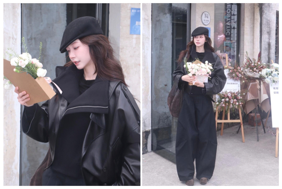 易梦玲以一身黑色造型演绎出“大张大合”的时髦张力。宽肩设计强化气场,上衣领口以V字形张开,瞬间点亮全黑造型,更是直接构筑整体造型的身线 ,再简单地搭配一顶黑色报童帽,静谧与冷酷并存,简约却极具冲击力。