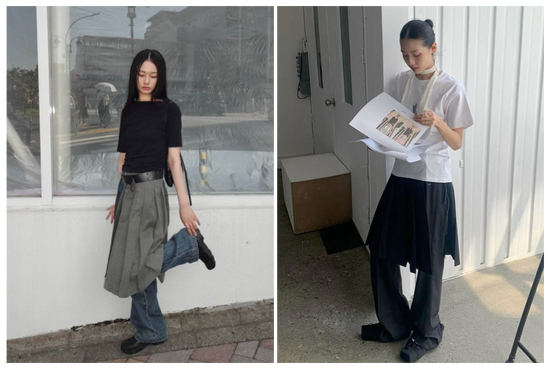 将裙装作为外层穿着,围裹于长裤之外,半裙、长裙甚至连衣裙都可以通过这种方式穿出新意,既宽松有型,又不束缚身体,造型在松弛中流露酷感腔调,多变且很有个性。