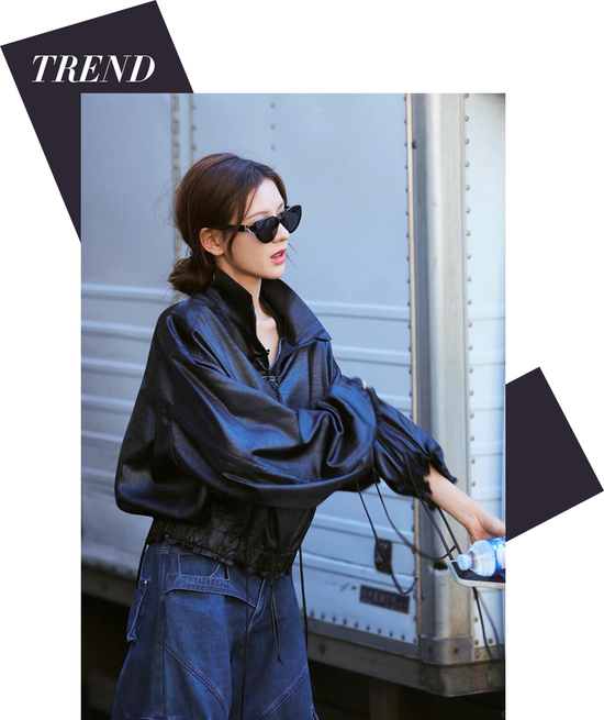 即使是基本款,只要宽松的剪裁及中性色调就可以打造出静酷风格,为整体搭配奠定沉稳的基调。张予曦这身造型从外套到长裤,每一处都暗藏剪裁的巧思。上宽下窄的皮夹克搭配抽绳袖口与衣摆,飒爽中透出复古气息。宽松牛仔裤凭借利落裤线勾勒随性的身姿,整体既个性十足,又不失洒脱风格。