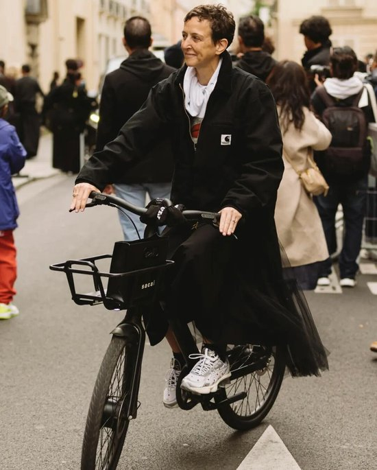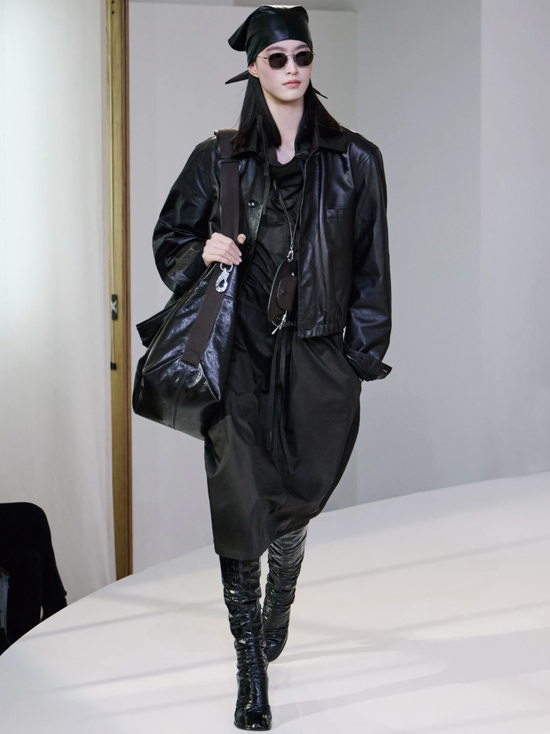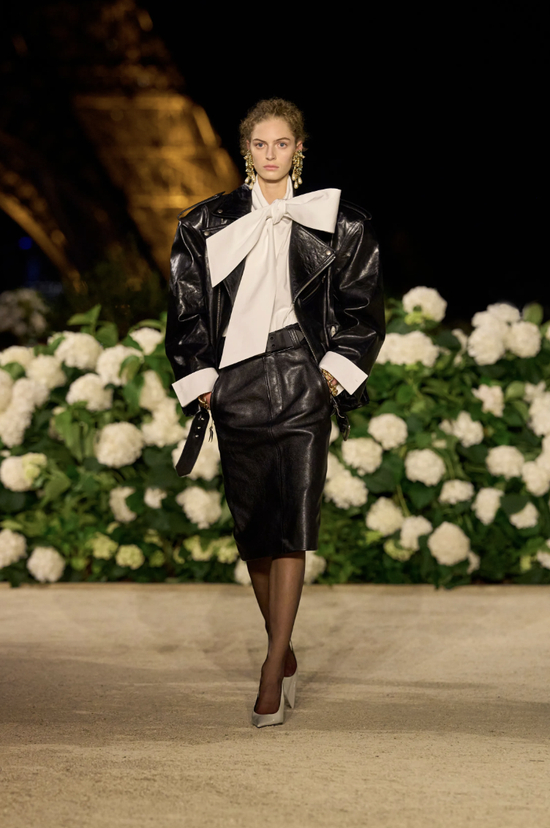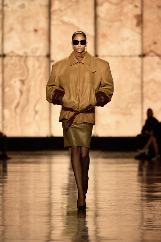 圣罗兰秀场上选择用皮夹克搭配皮裙,凌厉感满分,大女主气场拉满,但在日常中也可以尝试用它搭配一条飘逸的缎面吊带裙。这种材质的碰撞,让甜酷交织,高级得毫不费力。周末出门,蹬上长靴,你就是整条街最会穿的“在逃公主”——不过是能骑着摩托车自己跑路的那种。