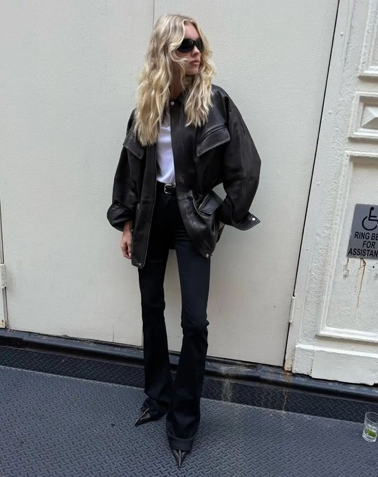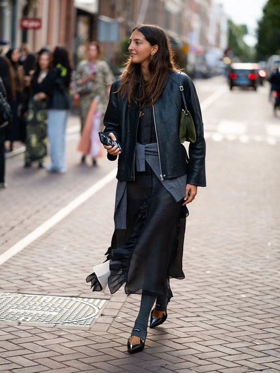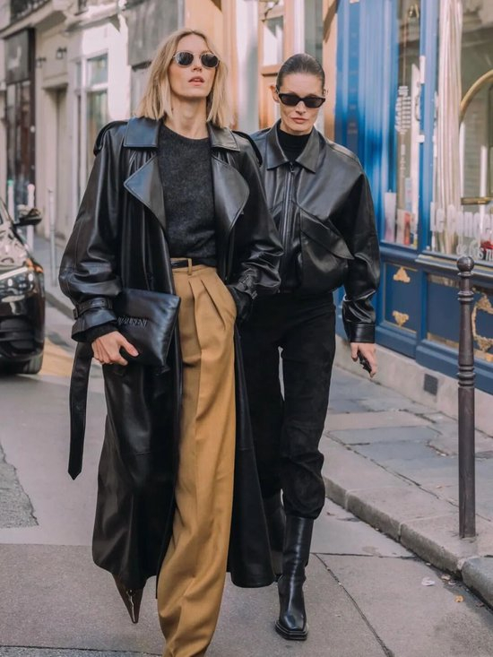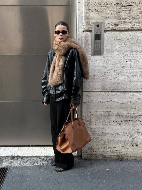 2025年秋冬皮夹克的搭配趋势是复古回潮,比起阔腿裤的搭配,微喇裤和skinny jeans似乎90年代超模那种毫不费力的时髦感?上身是宽松或短款的皮夹克,下身搭配一条能勾勒腿部线条的黑色铅笔裤,再配上一双尖头短靴或复古运动鞋,瞬间拉长身形。这套搭配的精髓在于“上宽下紧”,帅气利落,是出门逛街、看展绝不会出错的“懒人时髦公式”。