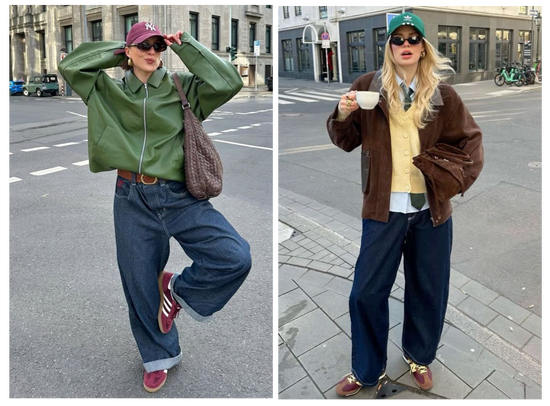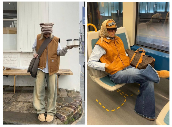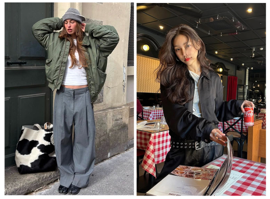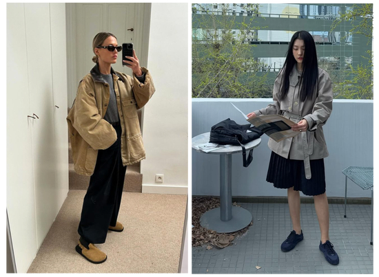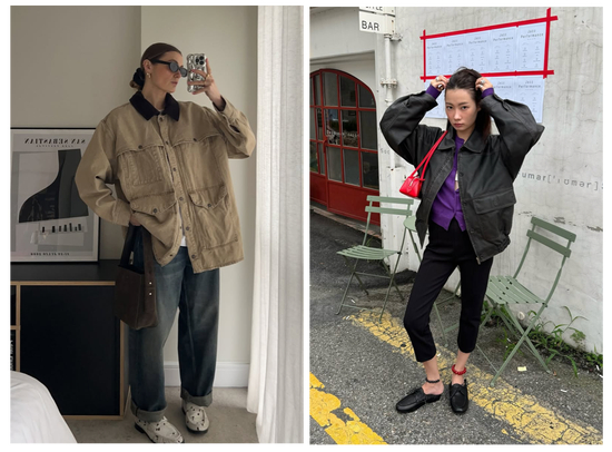 Oversize工装外套的宽松剪裁不仅穿着舒适,还不会产生膨胀感。这种板型为内搭提供了充分的自由度,下身搭配紧身裤遵循“上宽下窄”的穿衣法则,避免头重脚轻的视觉失衡,而搭配宽松直筒裤则能营造出一种松弛感,简单搭配基础款单品就足够时髦。