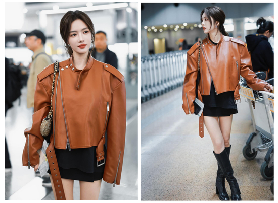 蔡文静在轮廓感夹克内,搭配一条黑色双叠加的黑色短裙,工装的粗犷廓形和皮质的材质给造型增添了几分率性,这样的混搭既舒适,又有层次,简单大气且不挑身材。