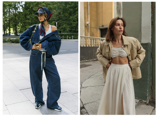 工装外套与Crop Top的搭配也很“惹眼”,将外套敞开穿着,利用落肩设计强调肩部线条,整体造型立刻显得随性又洒脱,挺括面料与露肤度的对比,突出层次的同时也将酷感与性感平衡得刚刚好。