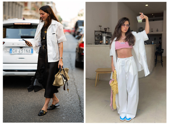 工装短袖外套穿起来则更硬朗飒爽,立体口袋与隐藏式扣位设计很有简约的美感,这种外套尤其适合窄肩身形,能够有效拓宽肩部比例,搭配优雅的半裙可柔化工装的硬朗,而与当下流行的“弯刀”长裤组合,则看起来清爽又高级。