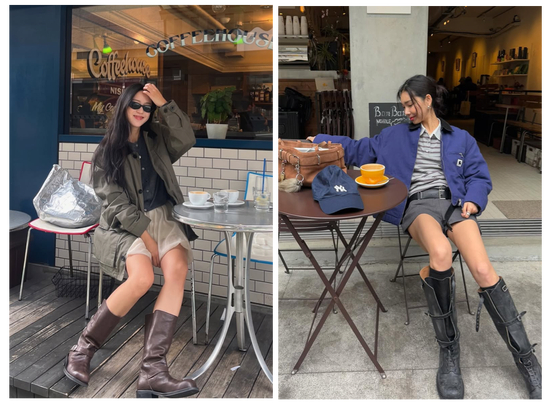 高帮牛仔皮靴与工装外套的组合,将复古与不羁风格推向极致,皮质光泽提升整体造型的酷感层次,只需一条短裤凸显腿部线条,便能拉满浓烈的氛围,一眼就让人无法忘却。
