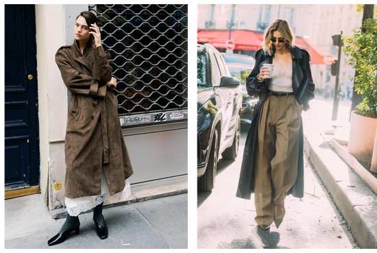 长款小羊皮夹克过膝的长度结合皮料特有的垂坠感,以及软滑细腻的触感,一上身就气场十足,内搭一条飘逸的蕾丝长裙,或搭配高腰西装裤,干练有力又帅气。