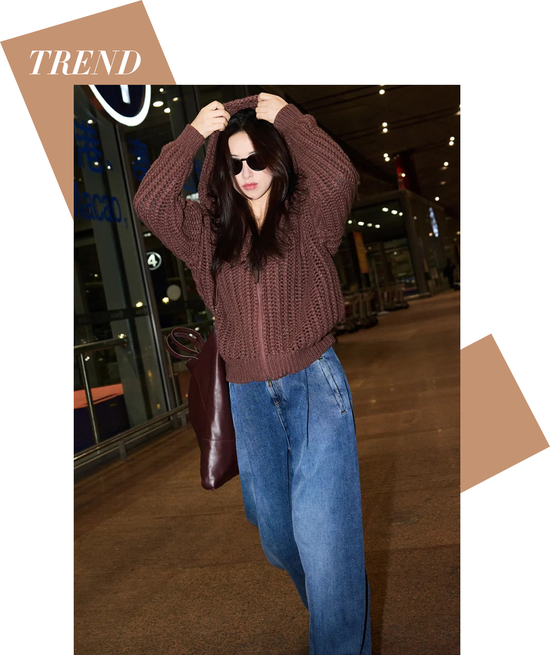熟龄感穿搭的魅力之一,就是它可以打破一些特有的穿搭方式,通过混搭将西装、衬衫和直筒牛仔裤穿出新的惊喜。朱珠很善于用干练简洁的线条塑造高级感,这身棕色针织毛衫,色彩沉稳且极致温柔,粗棒针编织的立体纹理更是质感的关键,再搭配一条宽松的深色水洗牛仔裤,将成熟与放松的状态达到一种平衡。