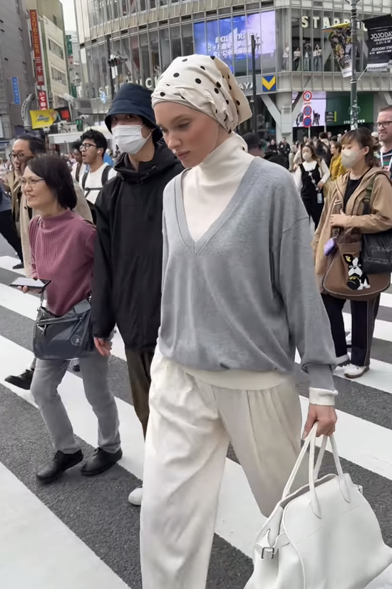 大家对于羊绒有个误区就是,一定很贵,但其实这种高级感,最关键的秘诀就是——光泽感。另一位The Row野生代言人Kendall Jenner,从她的街拍中更能看到比模特图更重要的羊绒面料在流动时的光泽感。那才是“显贵”的最终奥义。