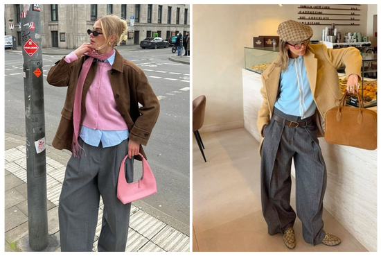 灰色西装长裤宽松的裤管与微微拖地的长度,轻松为造型塑造出如雕塑般的轮廓感和高级感。灰色的中性低调让它成为百搭基础款,上身搭配一件亮色系的针织内搭,能瞬间打破灰色的沉静,为整体注入活力与呼吸感。