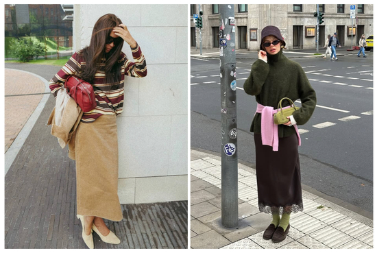 用质感毛衣搭配轻盈半裙,将宽松的毛衣下摆随意掖入裙腰,既能明确腰线又保留了慵懒韵味。脚下无论是搭配舒适的平底鞋还是复古乐福鞋,整体造型轻巧而富有细节,散发出一种不费力的雅致气息。