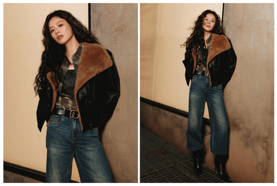马思纯将皮毛一体外套穿出了“柔软”的生命力,翻毛领蓬松致密的质感,撑起强大气场,帅气的皮夹克既兼顾了保暖又表达出风格感,再随性地内搭一件格纹衬衫,穿上暖和又好看。
