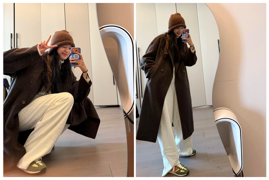 孙千这身很适合日常Softcore的穿着参考,乳白长裤以宽松剪裁构筑舒适圈,松垮的裤脚让造型的整体轮廓都显得很舒适,坚挺的长款大衣穿上更是立刻带来了一份松弛感,头顶那顶针织帽更是像一杯冬日热可可,软糯又温柔。