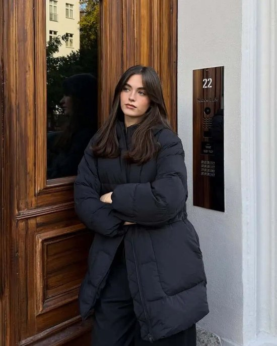 “一紧一收”的穿搭法则,能有效化解宽松版羽绒服的臃肿感,让整体的线条更为利落。试试搭配“收紧”效果加倍的直筒半裙,视觉上呈现匀称协调的身形比例。