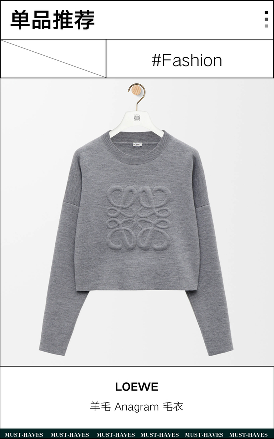 LOEWE这件浅灰色Anagram毛衣,羊毛面料自带柔暖质感,圆领对于各种脸型都非常友好,短款非常适合内搭在羽绒服里,利落不拖沓。