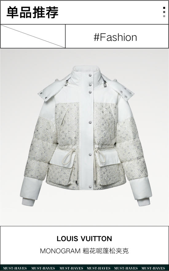 LOUIS VUITTON这件蓬松夹克很懂冬日需求,不同材质碰撞出满满的活力感,白鹅绒填充兼顾保暖与轻盈,可拆卸兜帽和可调节抽绳的设计让日常穿搭更加灵活。