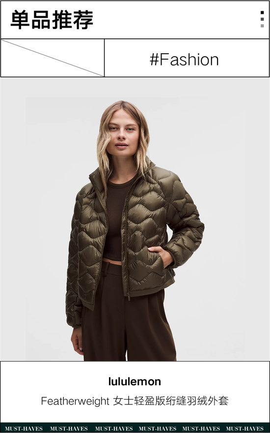 一件穿着轻松的羽绒服什么样?请看这件lululemon Featherweight羽绒外套,兼具扎实保暖、时髦质感与满分舒适度,以流畅剪裁搭配精致菱格绗缝,轻巧避开冬日臃肿,生命力十足。
