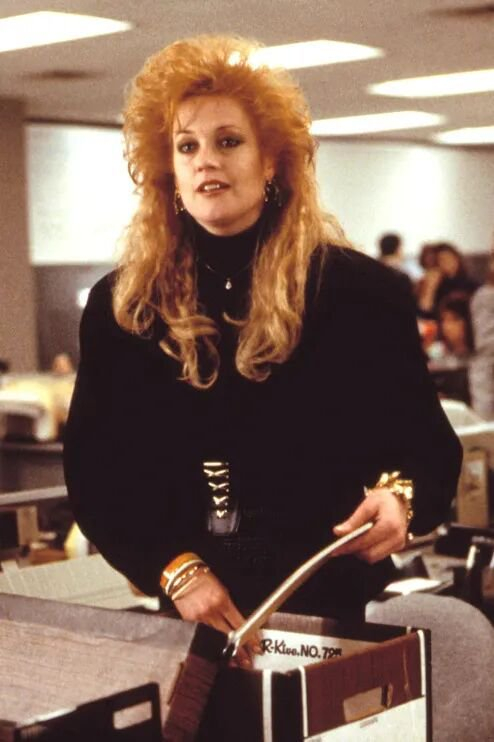 直到1980年代,职业女性开始大量涌入职场,权力着装(Power Dressing)应运而生。电影《上班女郎》(Working Girl)中,梅兰妮·格里菲斯饰演的苔丝用宽肩西装搭配铅笔裙,塑造了那个时代职场女性的典型形象。她的肩膀宽大而有力,腰身却依然紧束。这种沙漏型的轮廓,成为女性在男性主导世界中争取一席之地的无声宣言。