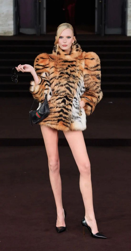 Alex Consani演绎的虎纹皮草更为惊艳。