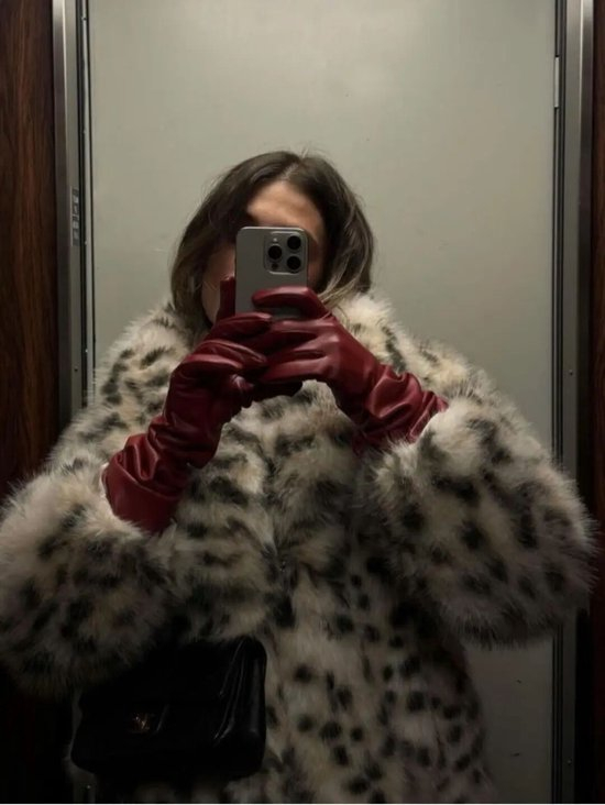 一件软乎乎的豹纹皮草搭配质感红色皮手套,
