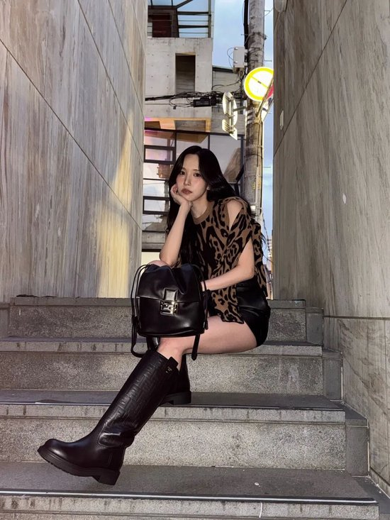 搭配棕色长靴不会抢了豹纹裙的风头,