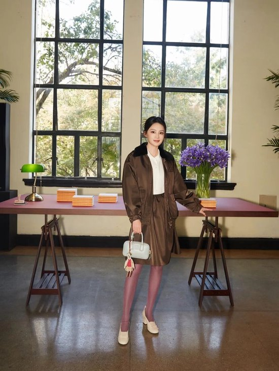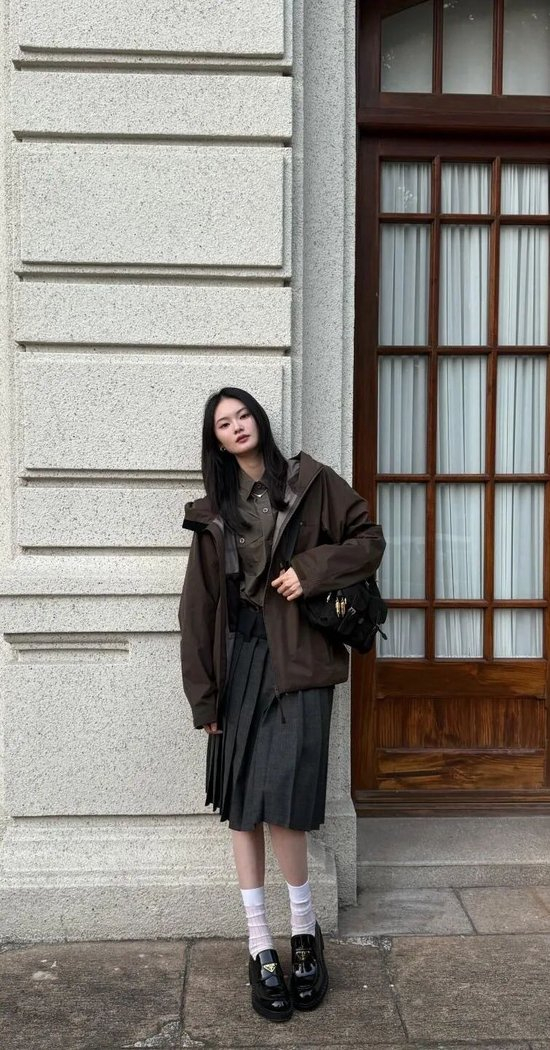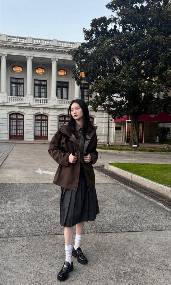 贺聪则是将风衣夹克穿出学院风,她选择了全身以深棕色为主色调,奠定了复古而沉稳的基调。内搭一件衬衫,并结合了下身的灰色百褶裙,这两件极具校园气息的单品,避免了过于甜腻,显得高级又别致。