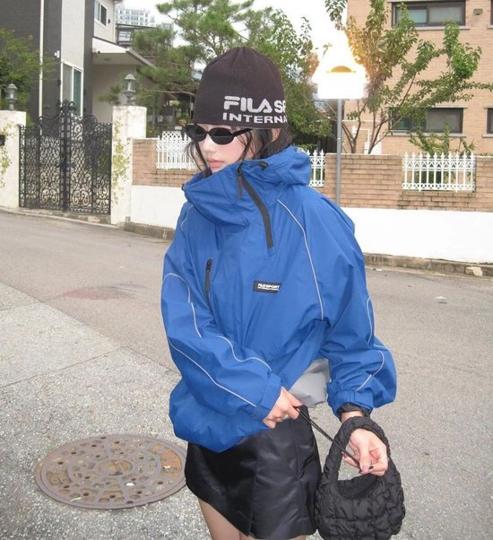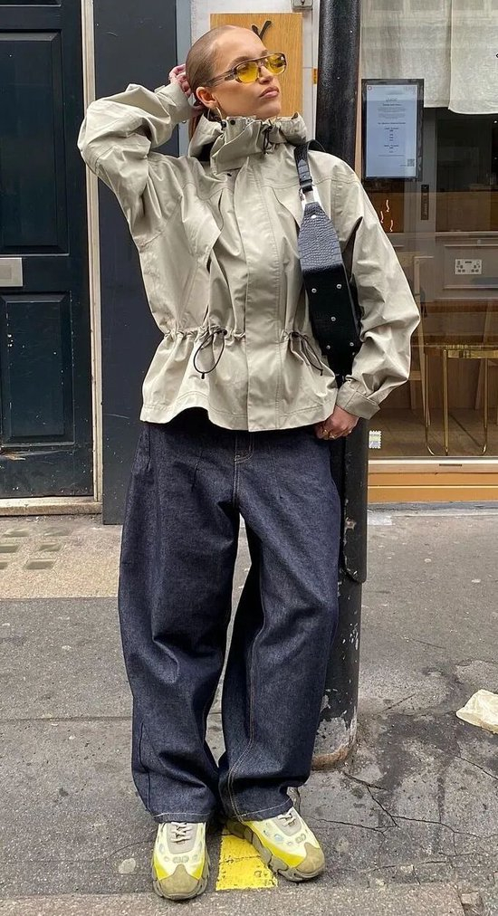 Oversized廓形的风衣夹克,可以通过层次叠穿来丰富视觉,更能营造出随性又不乏小心机的时髦感。将冲锋衣融入日常,与衣橱经典单品巧妙组合。卢昱晓上身的这件外套,两边宽松的袖笼与经典的落肩板型,不仅在视觉上弱化了肩部线条,在穿着体验上提供了极大的活动空间与舒适度,整体轮廓柔和随性,也将休闲氛围与舒适体感完美结合。