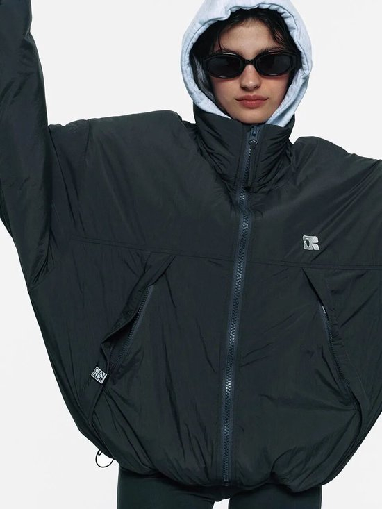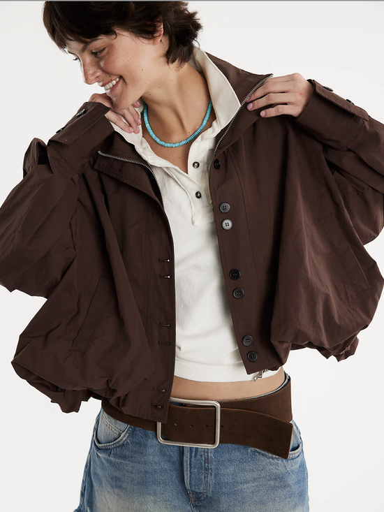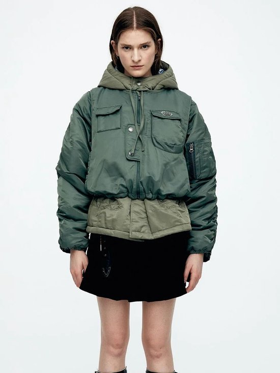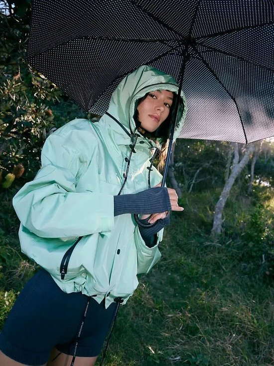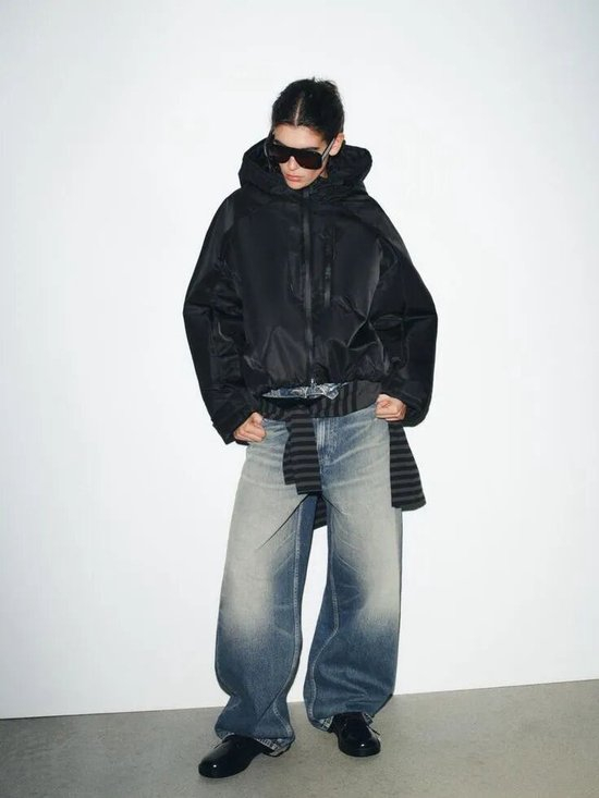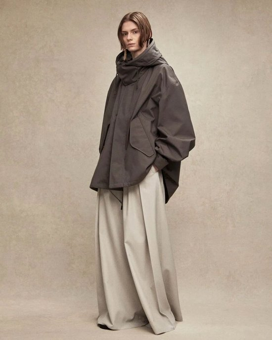 短款风衣夹克的领口与帽子可以被大幅度地敞开,形成流畅的V字线条,不仅为颈部留下了充足的呼吸感,敞开的领口与帽子垂坠顺滑,更让整体造型显得随性又利落。