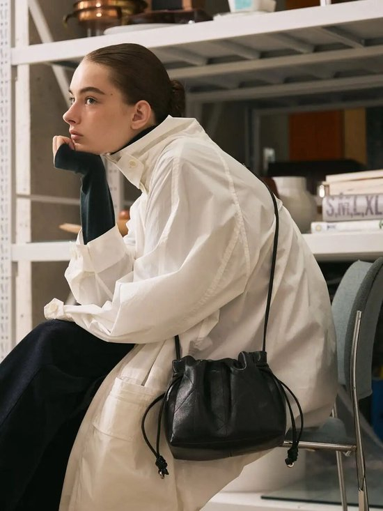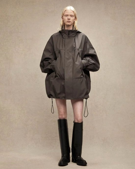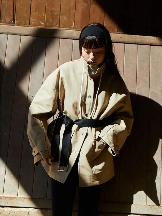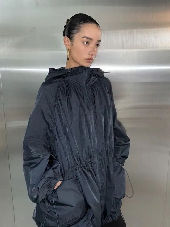 在腰部配备抽绳设计的风衣夹克,可以自由调节腰部的松紧空间,这种随心所欲的适应性,既避免了箱形廓形的膨胀,又通过自然的褶皱营造出层次,展现出一种不刻意、却极为高级的气质。