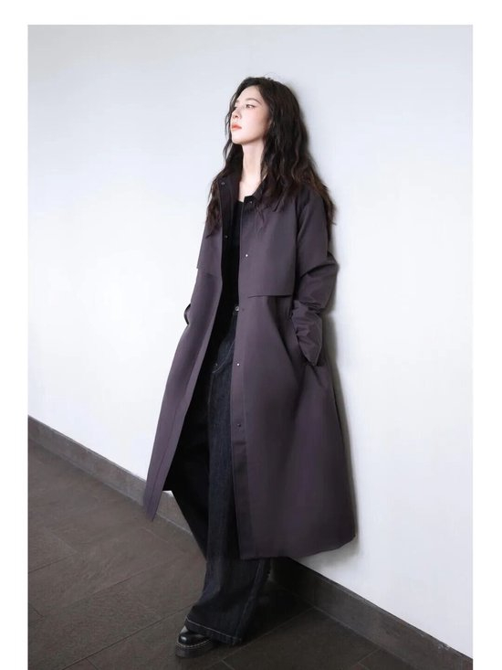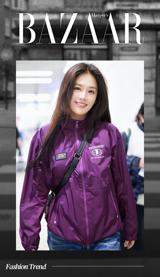 马思纯上身的这件紫色风衣夹克,醒目的色调瞬间从人群中跳脱出来,外套的轻薄材质与牛仔裤的休闲属性相结合,轻松营造出十足的时髦感。