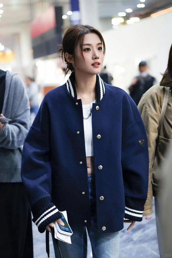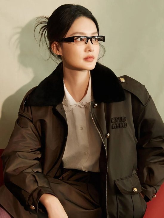 李沁的这身搭配将夹克穿出了独特的文艺气质,这件夹克剪裁别致且线条挺括,复古绿色尼龙面料还泛着一丝微妙的光泽感,提升了质感,底下一条富有设计感的半身裙,让整体散发着一种沉静而迷人的文艺气息。