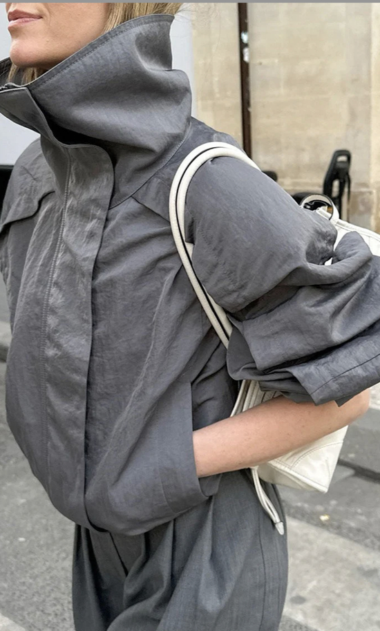 当立体廓形的风衣夹克遇见线条流畅的灰色西装裤,一种高级的松弛感便油然而生。风衣的硬朗与宽松剪裁,与西装裤垂顺的裤管相得益彰,更营造出一种不经意的疏离与洒脱。