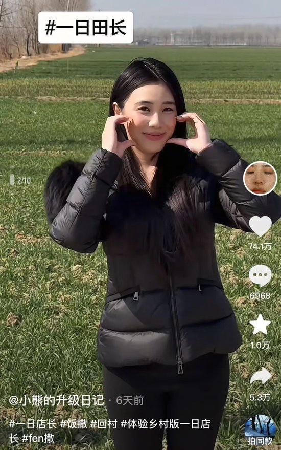 在轻快的bgm中,主人公站在村头/地里/鸡舍/炕上……对着镜头“饭撒”:脸颊比心、双手比心,小猫耳朵,头顶打着#一日村长/田长/鸡长/床长……的tag。