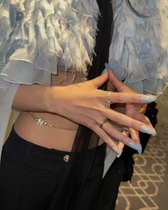 比如透绿、淡水蓝美甲搭配银色首饰,